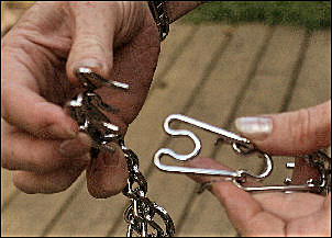 To open a prong, ready for fitting, hold adjacent links in each hand and pull upwards on the link with the prongs.