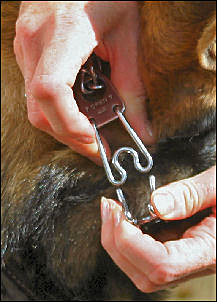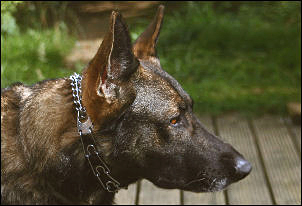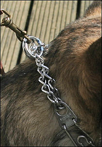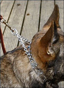 One of the first controversial pieces of equipment in this section, this german collar is very popular with Schutzhund trainers. Without getting heavily in to the pros and cons which you will find on other sites, I personally have found a prong collar to be an invaluable tool when walking dogs, a prong will stop any lunging and pulling behavior. I call it my "power steering"! It does not need to be used roughly to effect a response, and is a useful correction tool when the dog is high in drive; in protection for instance. In order to work effectively, it must be fitted correctly, enough links should be removed that it sits snuggly behind the ears.