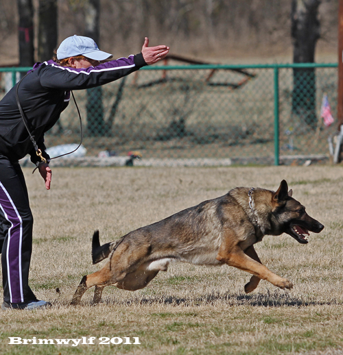 Once the dog can run the entire length of the field, we begin putting the target out before we begin training, before getting the dog out of the car. The first few times we do this, we start the dog much closer to the target point again. Then we start to fade the original cue with the hand by the dog's head because we cannot use that in trial.